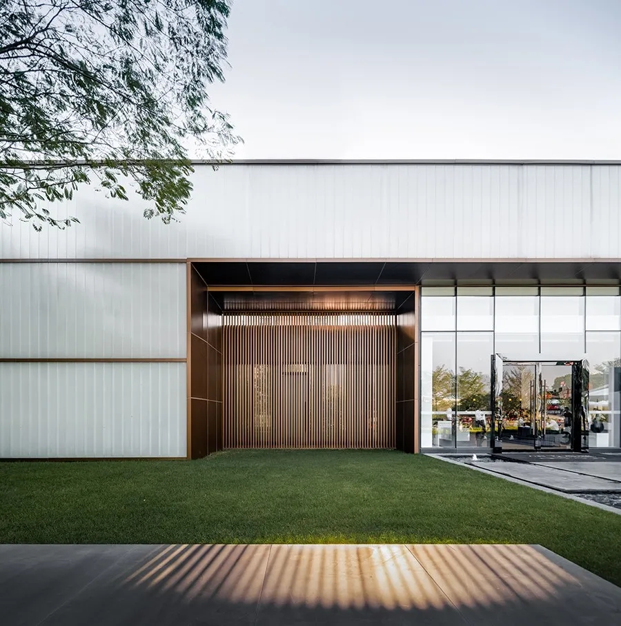 在建筑面积近四千平方米的整体商业空间中,都易的设计方案以打造富有品质感的城市临街界面为出发点,通过镂空铝合金百叶造型及玻璃幕墙,形成简洁明晰的外观造型,强化了建筑物的标志性和体量感。