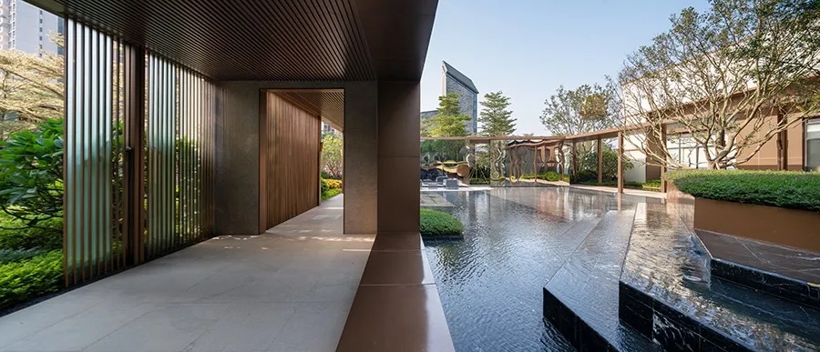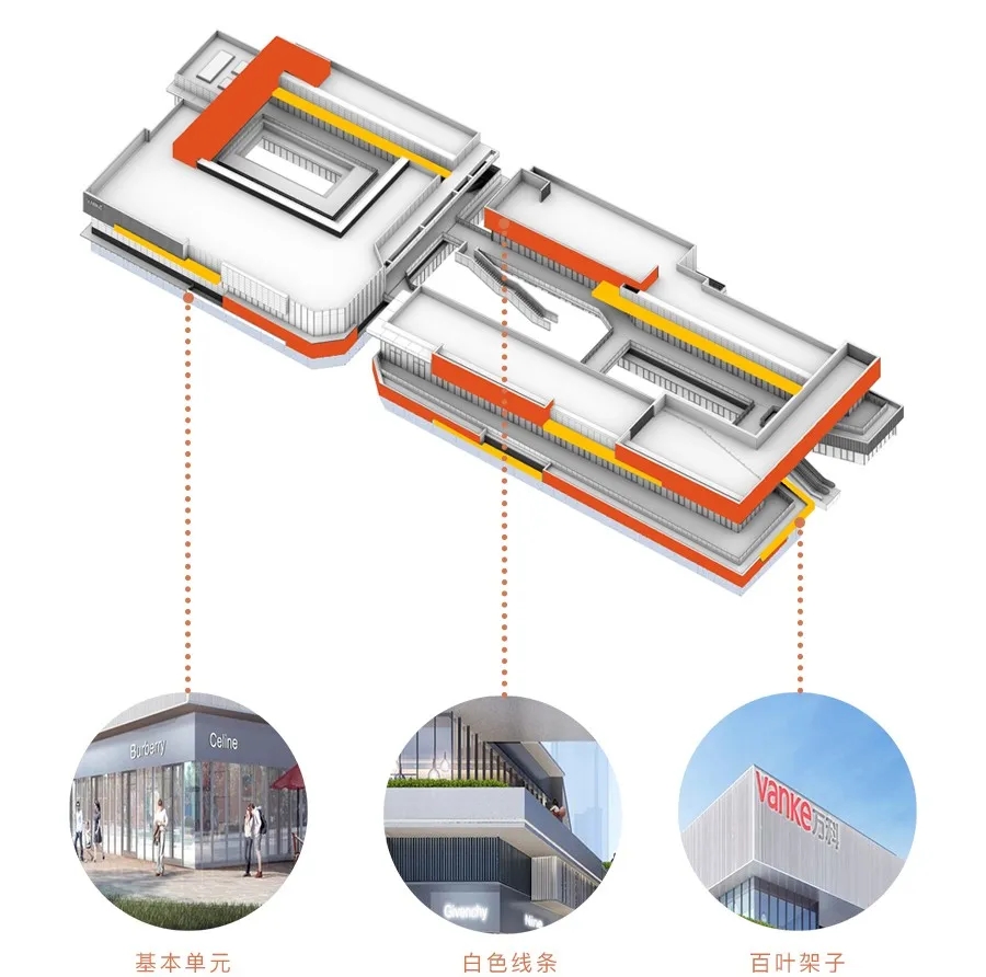 位于商业空间东端的主入口设计,建筑师利用大跨度结构,形成与南方湿热气候进一步契合的都市社区公共空间。主入口广场与商业内街在此自然衔接,让市民可以自由出入这个开放式的城市客厅。六座体量不一的商业盒子穿插在东西向的商业主动线左右,动线内部规划了若干自然采光的绿化中庭,在岭南的气候条件下展现社区消费的活力,也成为公共空间自然通风的健康保障。