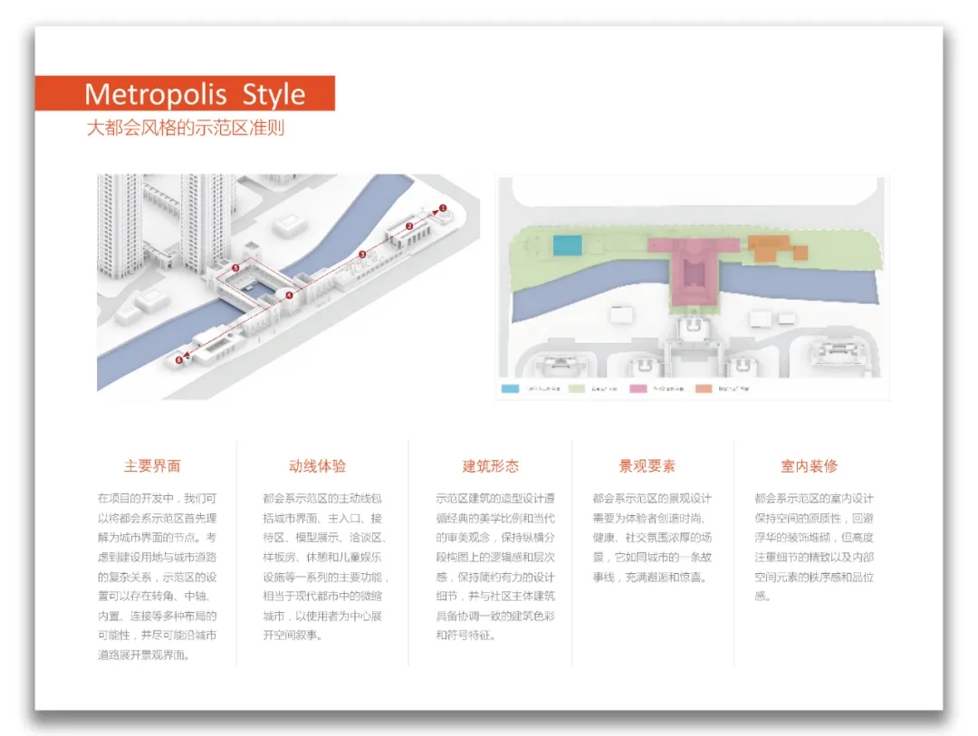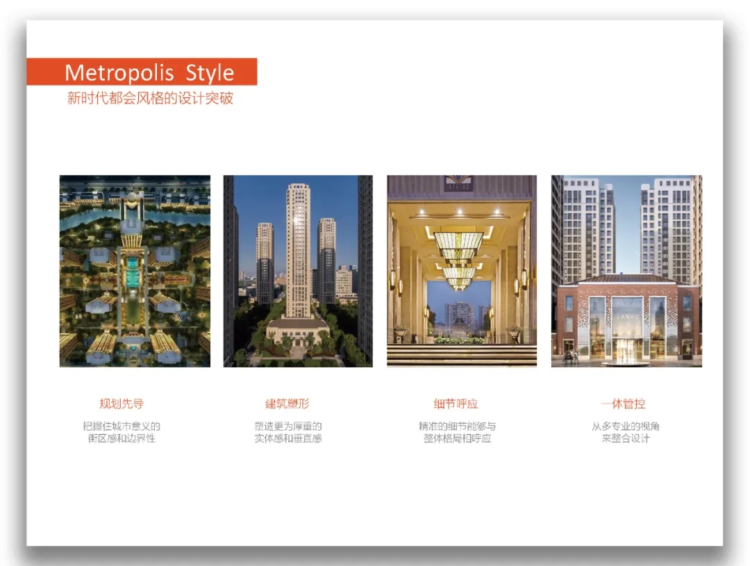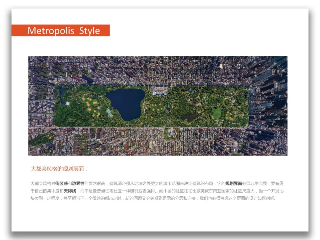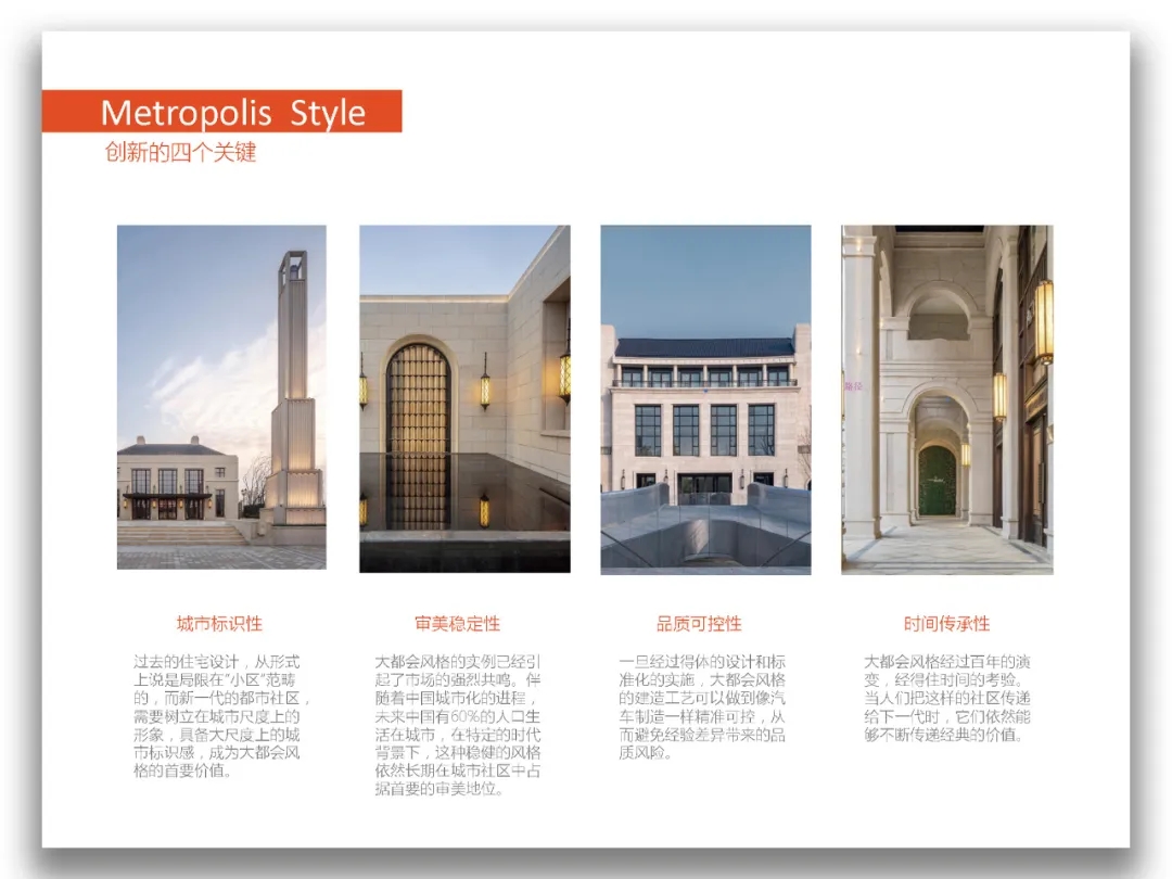 从大都会风格的形式基础、规划层面、建筑尺度、细节、源起、思辨、创新的四个关键、设计突破、规划准则、示范区准则、立面准则、细节准则等十二个环节,层层递进、由广入精,全面阐述了杨锋先生对大都会风格系统的解析认知,以及在设计语言上遵循经典并与时俱进创新研发的原则。使这一经典的设计风格,不断焕发生命力,符合时代与市场的主流审美。