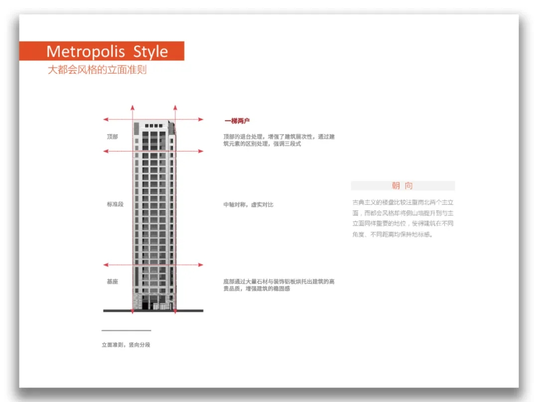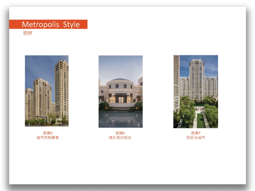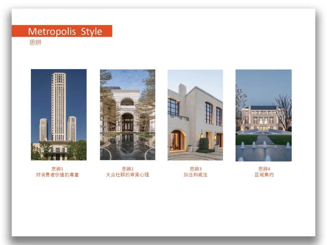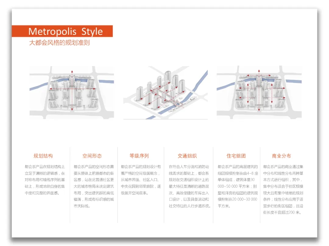 从大都会风格的形式基础、规划层面、建筑尺度、细节、源起、思辨、创新的四个关键、设计突破、规划准则、示范区准则、立面准则、细节准则等十二个环节,层层递进、由广入精,全面阐述了杨锋先生对大都会风格系统的解析认知,以及在设计语言上遵循经典并与时俱进创新研发的原则。使这一经典的设计风格,不断焕发生命力,符合时代与市场的主流审美。