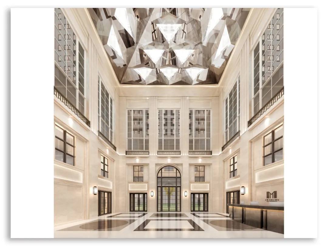 一是规划层面,要把握住街区感和边界性。都会风格的项目,在最初的规划环节,就不能只从地块本身来考虑,而是要从两三千米甚至更大的城市范围来决定建筑的布局,强调一种天际线的感觉。在总平面上,它的规划界面要非常完整,有属于自己的集中度,不是像普通住宅按强排方案调整而来。在连廊和大堂等位置,都会风格会更注重彼此的连接而不仅仅是装饰。内部交通流线组织和功能分区本质上还是现代的逻辑。