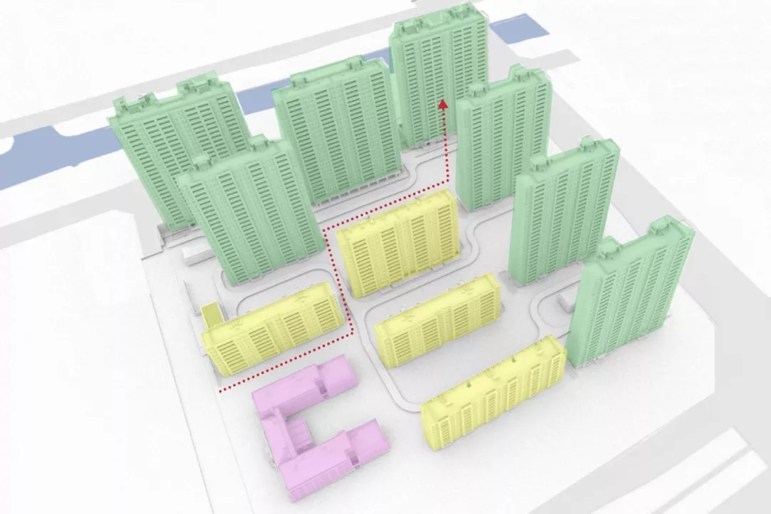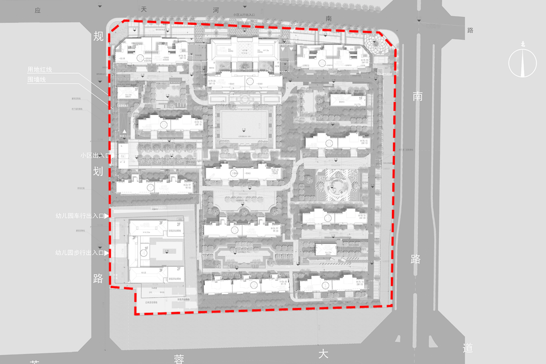 从规划条件看,6万平方米的用地面积、15万平方米的计容建筑面积,80米的建筑高度限定,决定了万科江阴时代都会项目如果缺乏更高维度的城市思考,极可能落入常规的“强排社区”俗套。对于都易设计而言,面对约240米边长的正方形,考虑到地块北部临河、东部和南部紧贴都市干道,社区的整体存在一个对都市形象的考量,而较为保守的退界条件及建筑限高,又很难做出杭州金辰之光、上海青藤公园这类经典案例所具备的点式高层建筑组团。