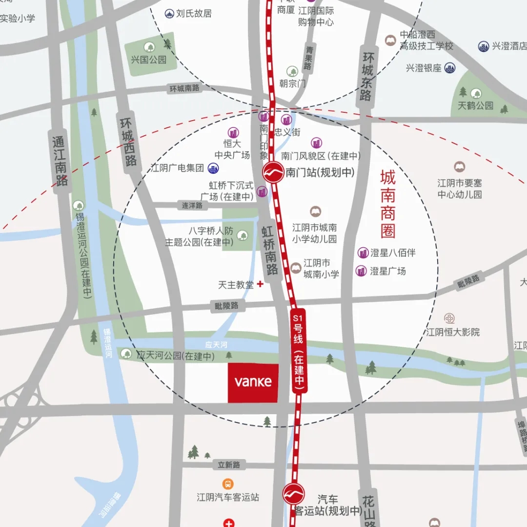 全新的万科江阴时代都会项目位于芙蓉大道北侧,虹桥南路西侧,应天河南侧,周边交通发达,不仅毗邻即将通车的江阴市轨道交通S1线,也具备一小时直达苏锡常的高速公路连接体系。地块本身接近正方形,非常适合用“都会系列”的产品来回应本案的地形条件。