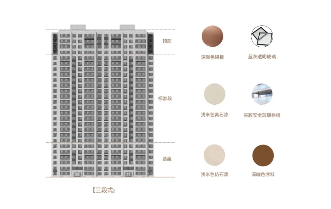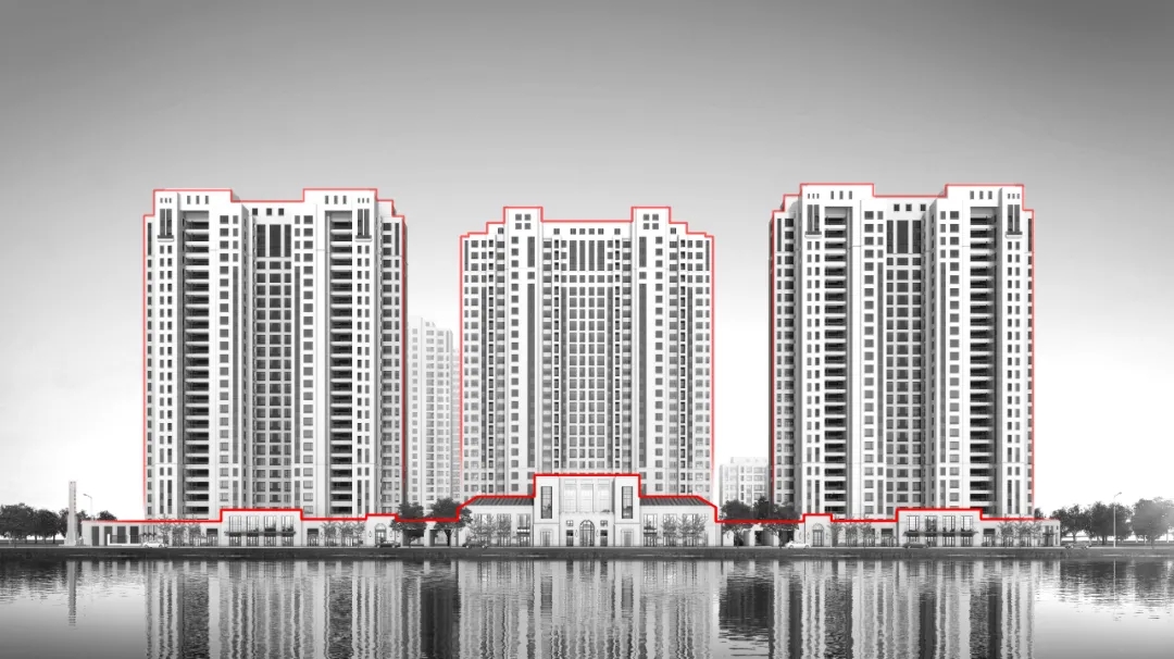 本案的建筑立面可以理解为经典大都会风格的一种大胆的简约:竖向三段式构图依然是基础,但角部的装饰细节更为收敛,仅在窗框和阳台金属栏板进行了深色处理。这种简约设计的意图在于将多座建筑用不加繁琐的语言整体呈现。户型内部客厅与主卧室的联通阳台,在外立面增加了一定程度的水平感,这种水平感被嵌套在厚重的大都会风格中,暗示着一种生活的时代感。