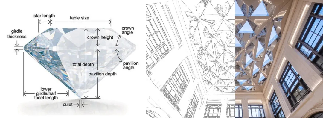 双层挑高12*12*12m的扩大立方空间演绎了经典的都会空间,四周的模数墙面在垂直和水平两个维度不停地强化都会印象,推至头顶是本案的又一个惊喜点,在方形模数之下引入立体三角形镜面,整体宛如钻石镶嵌,吊顶本身留有6个三角形采光口,这样在白天与夜晚都会产生丰富的光影变化,将空间的氛围渲染至另一个全新的境界。都会的比例加上创新的光影与材料,点题了设计师所追求的都会与创新。