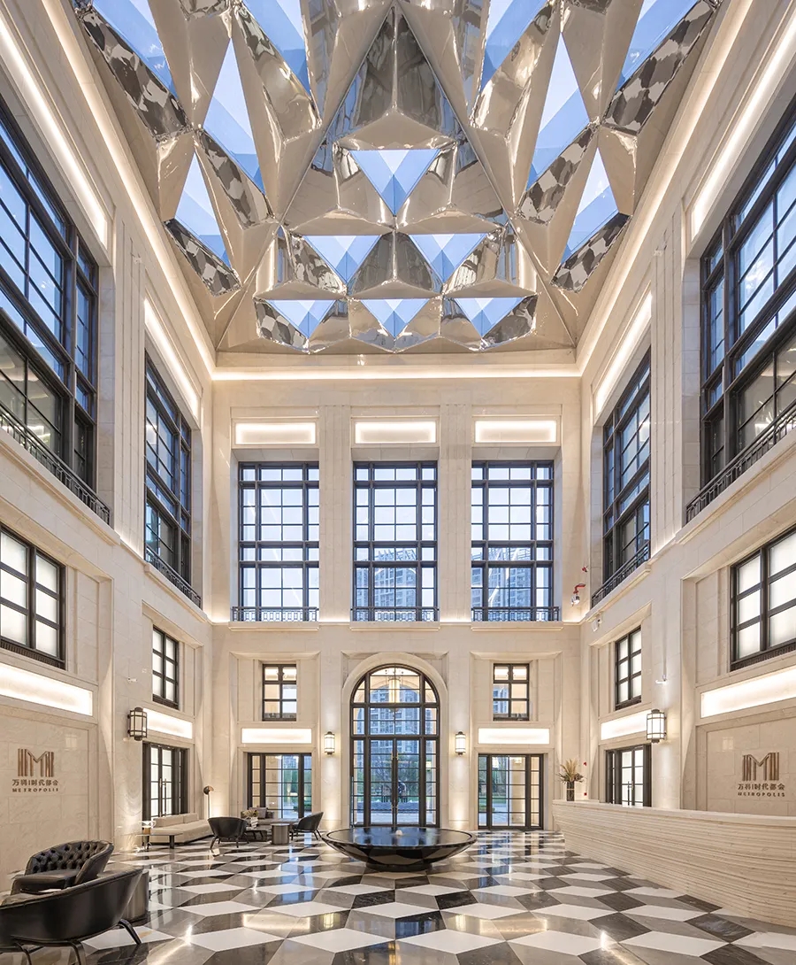这种整合的“设计力”表现在:经典的都会风格从示范区大堂外部传递到内部,表达在石材与玻璃的比例和细节之中,而创新之处在高达15米的展示空间顶部,都易设计采用镜面不锈钢钻石几何切割的方式,悬挂起一番别样的都市风景,暗示着“都市”对于城市社区的牵引力。尤其是照明设计,被建筑师细腻地整合在空间自上而下的不同层次,唤醒了光线对时尚的呼应。