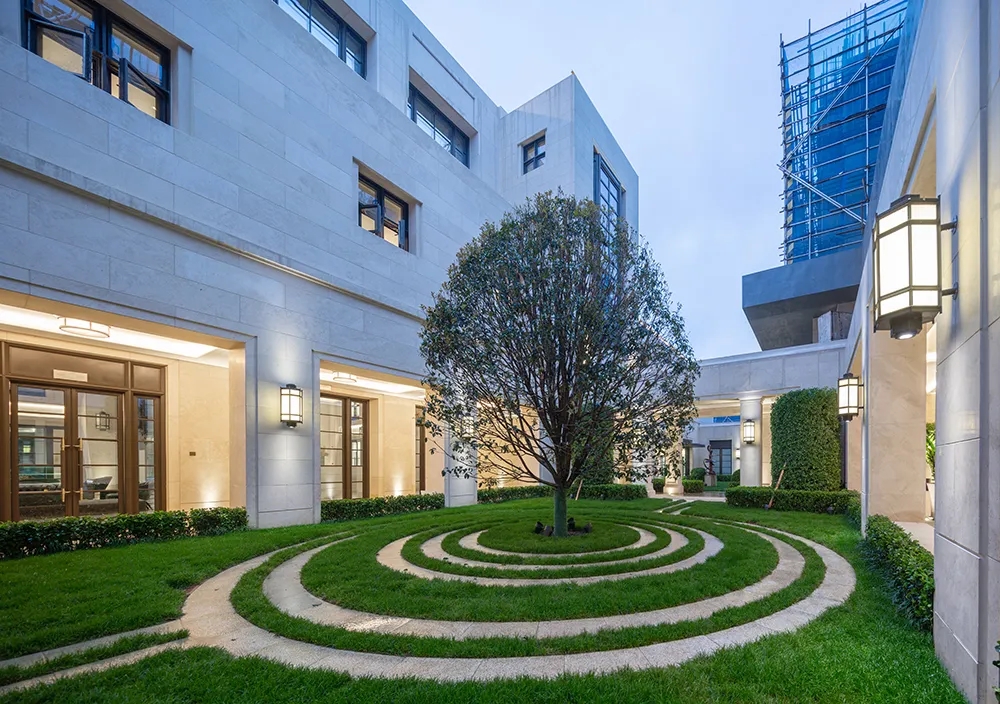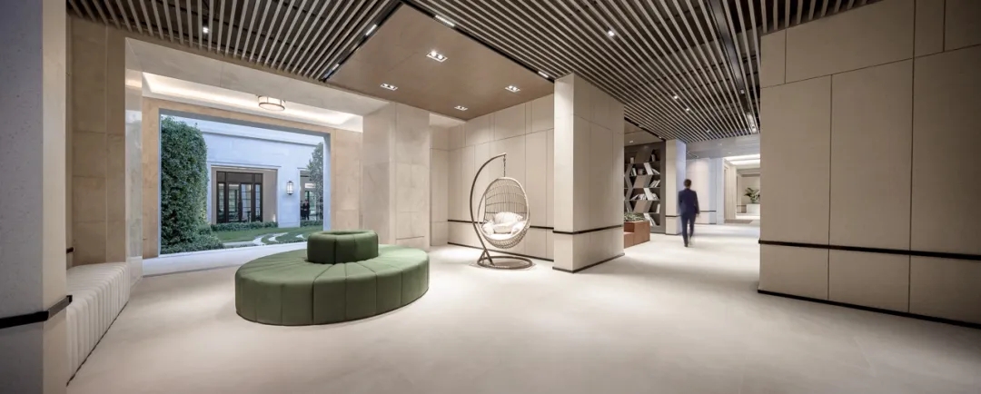 穿过中心大堂,紧接着的是连接后方楼王的回形走廊,空间感受又一次落入平缓。中心回廊内部是中心花园,回廊东西两侧饰以小花园,三座秘密花园渲染都会的氛围的同时,也强化了视觉与空间的纵深体验。