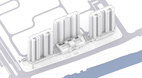 商业广场正对的是沿街商铺,作为示范区主楼的副段,也是整个沿河展示面的副段。本身又蕴含了都会立面美学的主次设计,暗合了由扩大的场域到每个细部单体再到每个细部构件都遵循都会立面美学的规则。